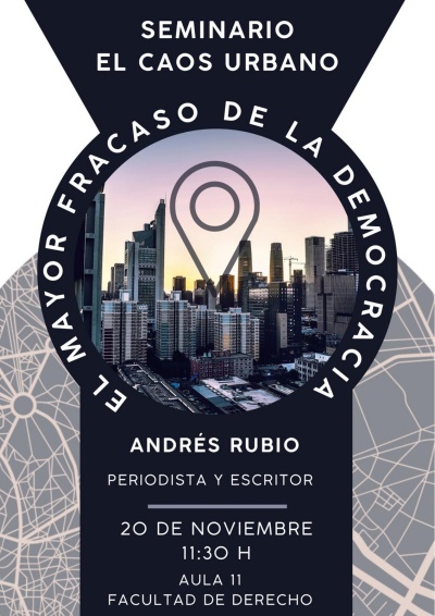 El próximo jueves día 20 de noviembre, a las 11:30 h. en el Aula 11, tendrá lugar otra conferencia impartida por Andrés Rubio, periodista y que tiene por título: "El caos urbano, el mayor fracaso de la democracia."